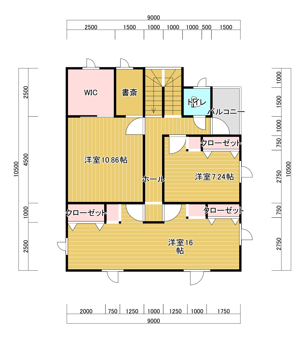 1階 リビング (10.56帖) 食堂 (6帖) キッチン (5.7帖) 和室(7.54帖) 洋室(7.54帖) 2階洋室(16帖) 洋室(7.24帖) 洋室(10帖)
